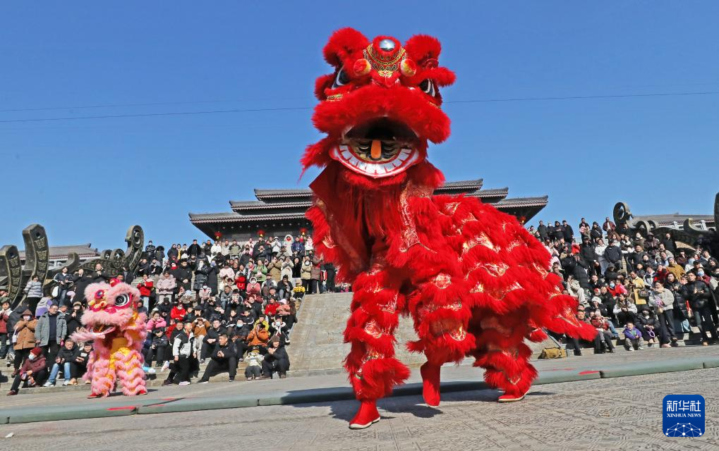 1月29日,在山东省临沂市郯城县郯国古城景区,演员在表演舞狮。新华社发(张春雷摄)