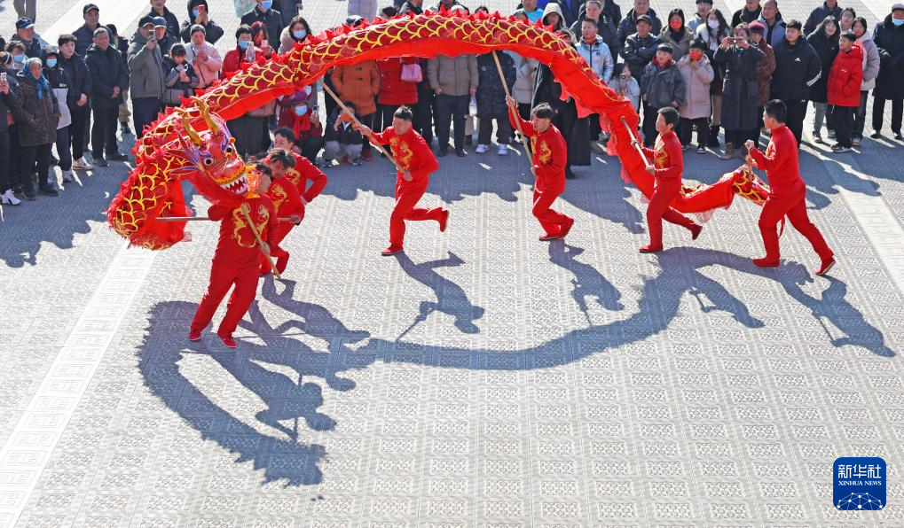 1月29日,在山东省临沂市郯城县郯国古城景区,演员在表演舞龙。新华社发(张春雷摄)