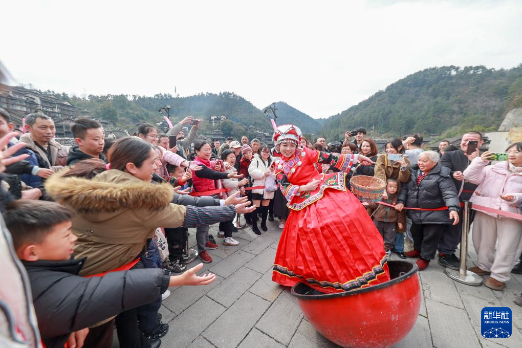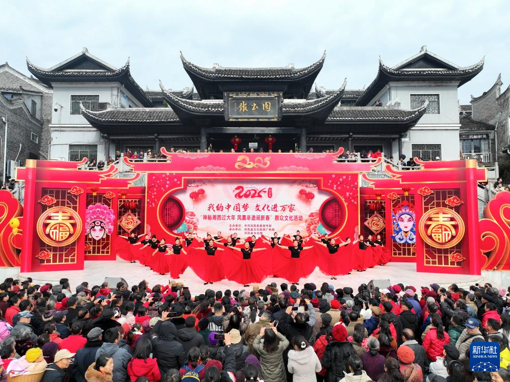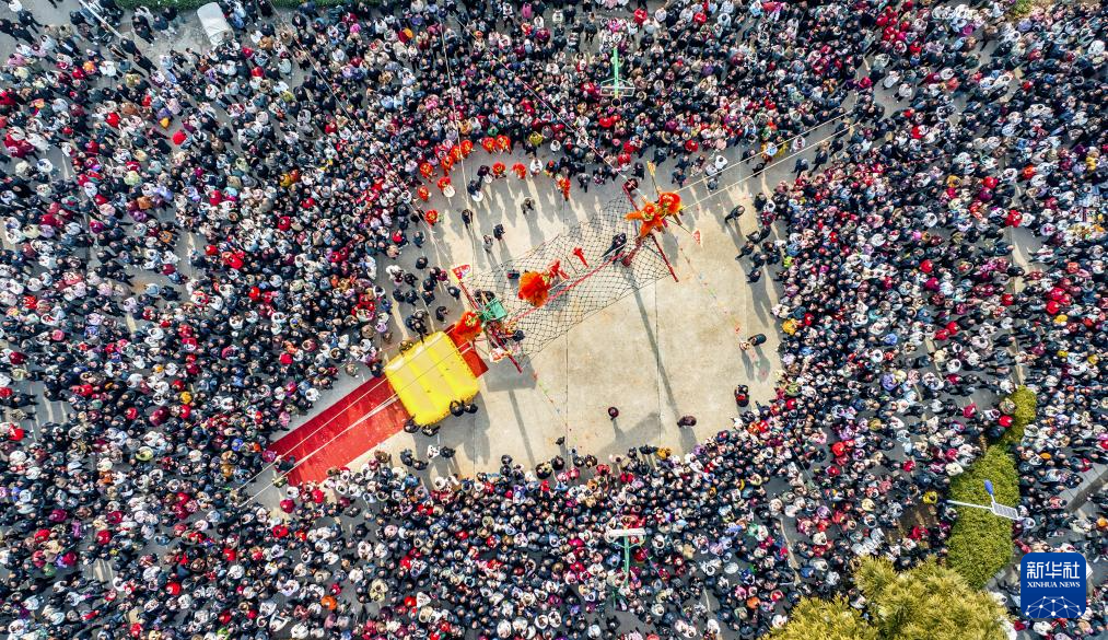 1月29日,在湖南省湘西土家族苗族自治州凤凰县文化广场,群众在观看文化活动节目表演(无人机照片)。新华社发(周秀鱼春摄)