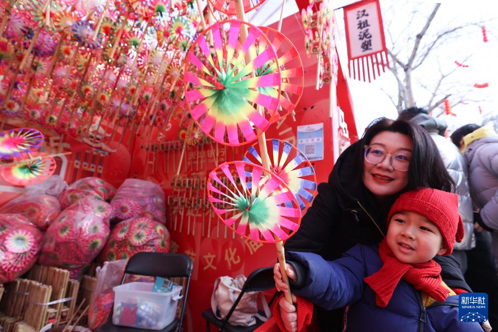 1月29日,一名家长带着孩子在北京龙潭庙会上选购风筝。新华社发(陈晓根摄)