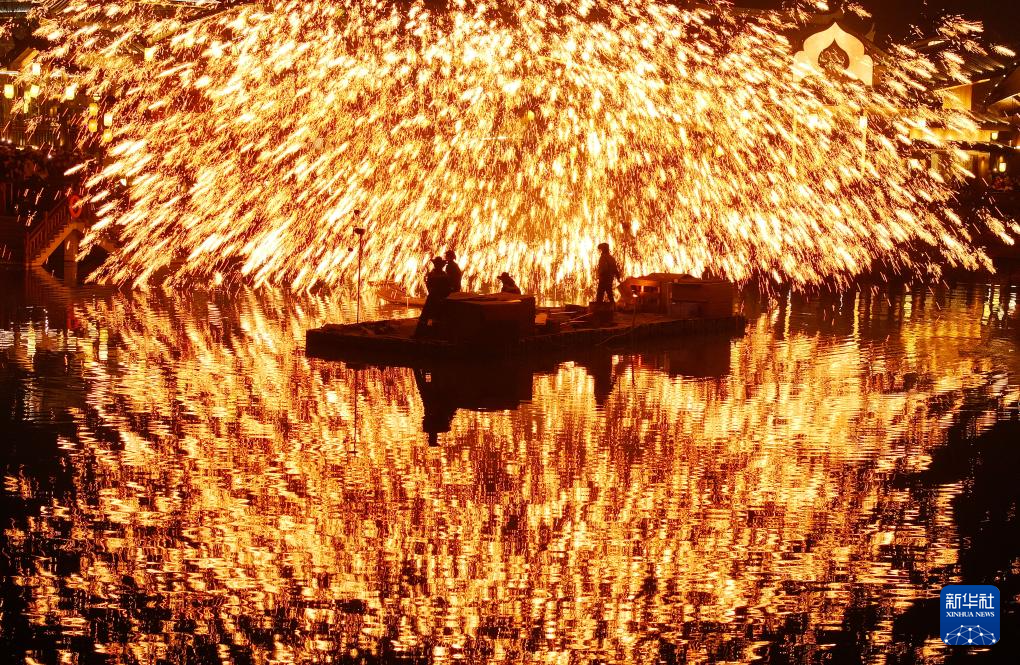 1月29日,在湖南省衡阳市南岳区“南岳里”庙会民俗美食街区,民间艺人在为游客表演非遗打铁花(无人机照片)。新华社发(曹正平摄)