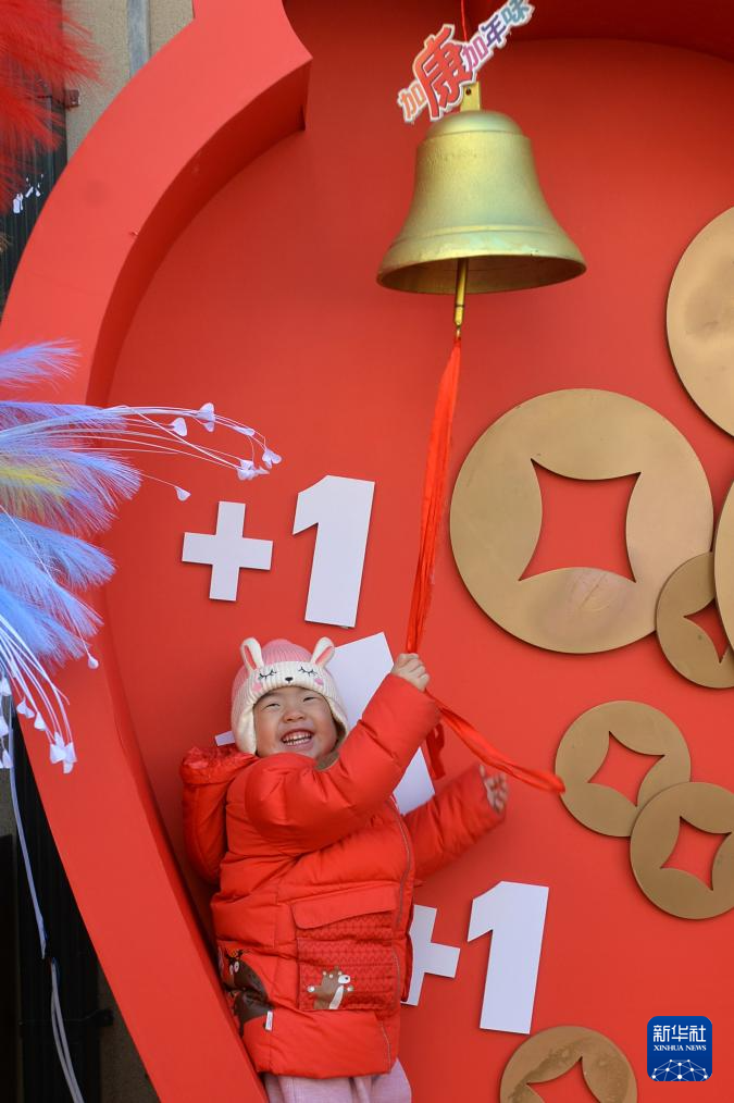 1月29日,在山东省青岛市市北区大鲍岛文化休闲街区举办的“里院新年”迎春活动上,一名小朋友在摇铃祈福。新华社发(王海滨摄)