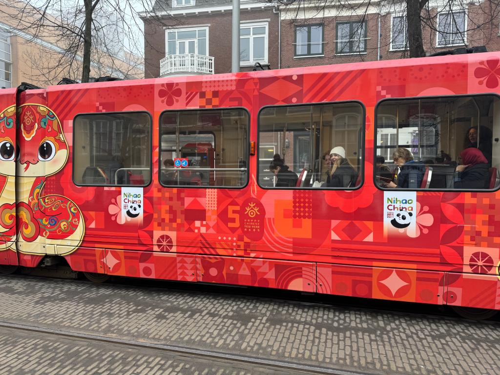 在荷兰海牙,“欢乐春节”彩绘电车为街头增添浓厚的中国年氛围。