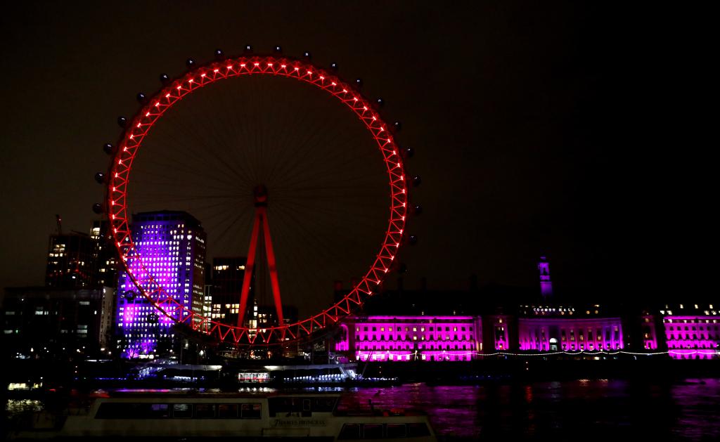 1月28日,英国首都伦敦的地标建筑“伦敦眼”亮起红色灯光。新华社记者 李颖 摄