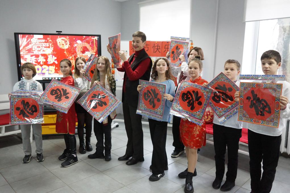 1月28日,师生在乌克兰基辅第一东方语言学校手举福字合影留念。新华社发(罗曼·佩图什科夫摄)