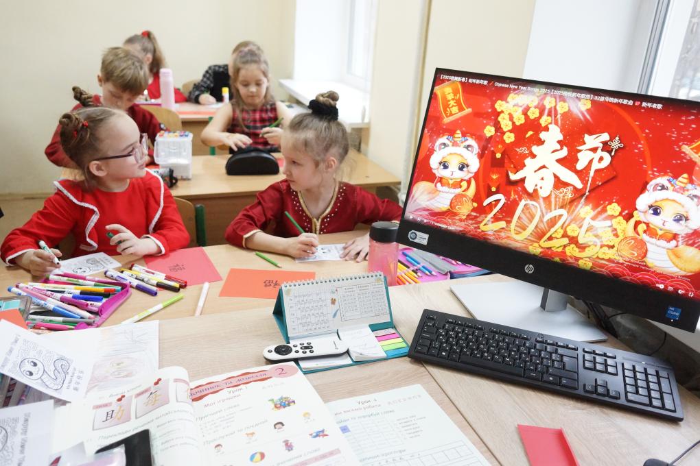 1月28日,学生在乌克兰基辅第一东方语言学校创作春节贺卡。新华社发(罗曼·佩图什科夫摄)