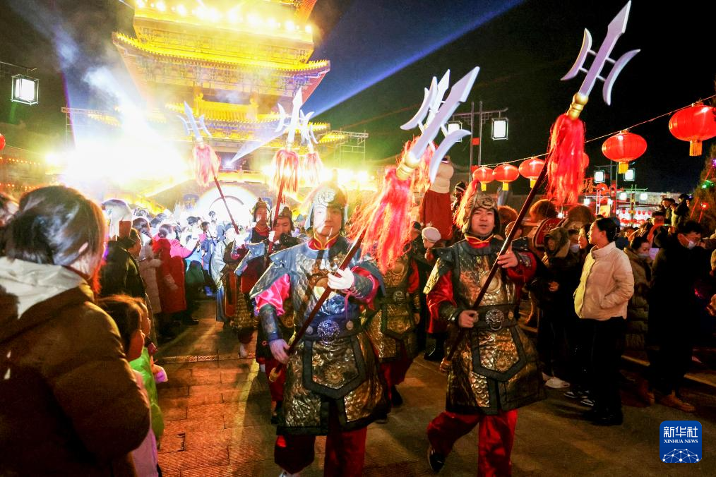 2月1日,游客在甘肃省张掖市甘州府城“丝绸之路·甘州不夜城”活动上观看表演。新华社发(成林摄)