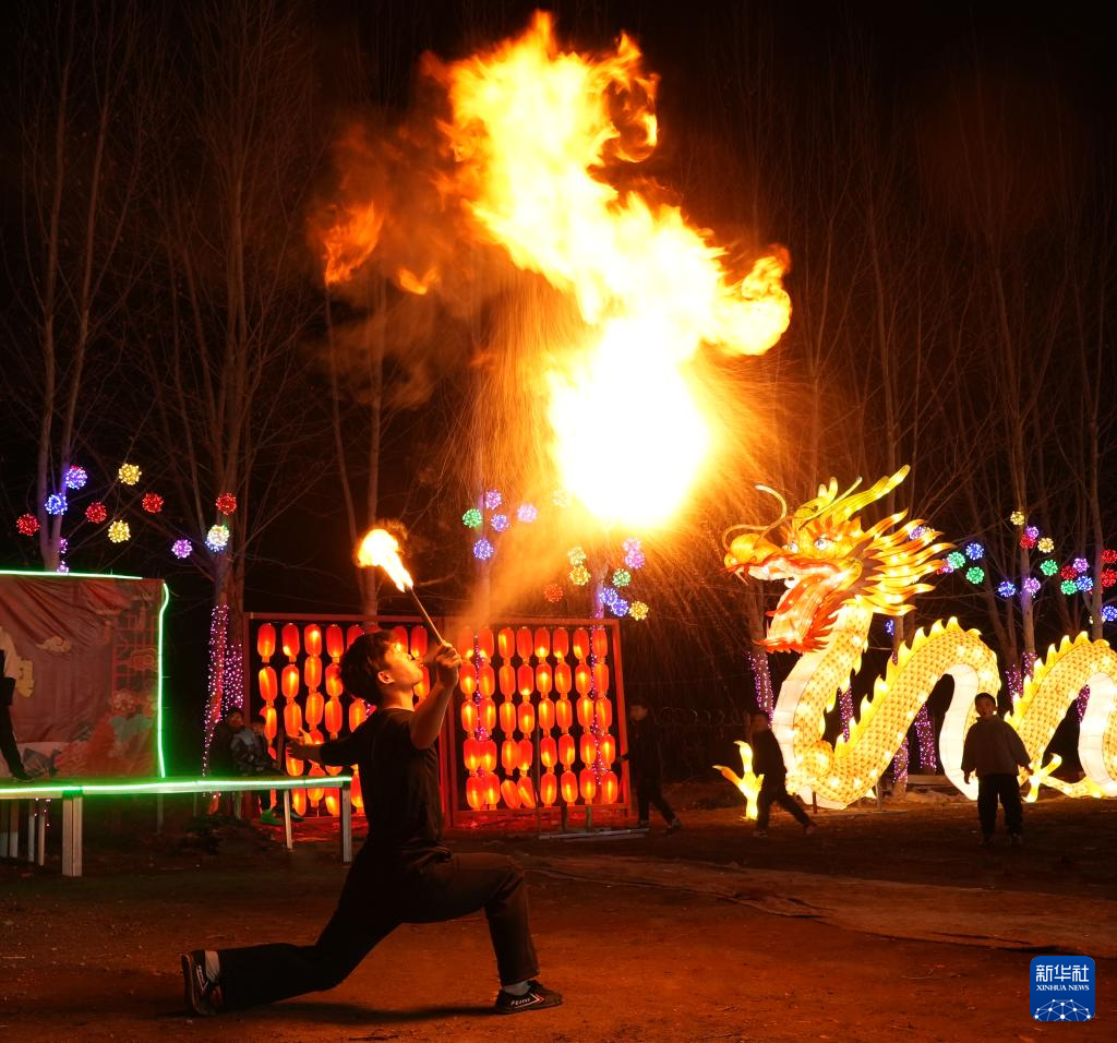 2月1日,民间艺人在河南省开封市尉氏县十八里镇一景区表演气功喷火。新华社发(李新义摄)