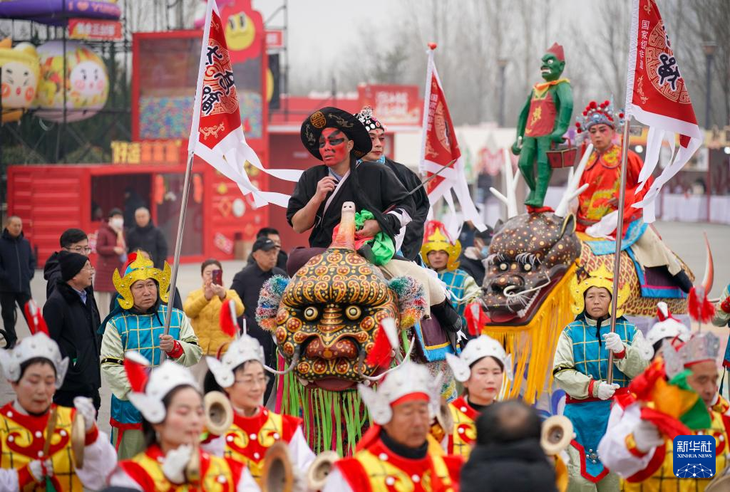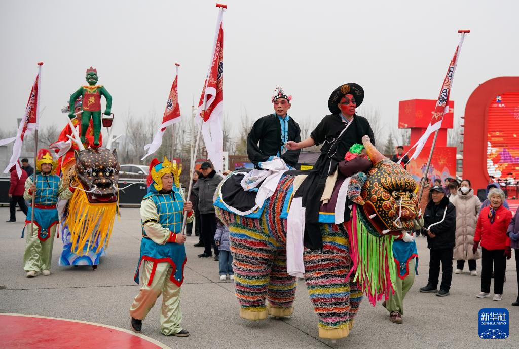 2月1日,民间艺人在山西省运城市禹都公园表演高跷走兽。新华社发(闫鑫摄)