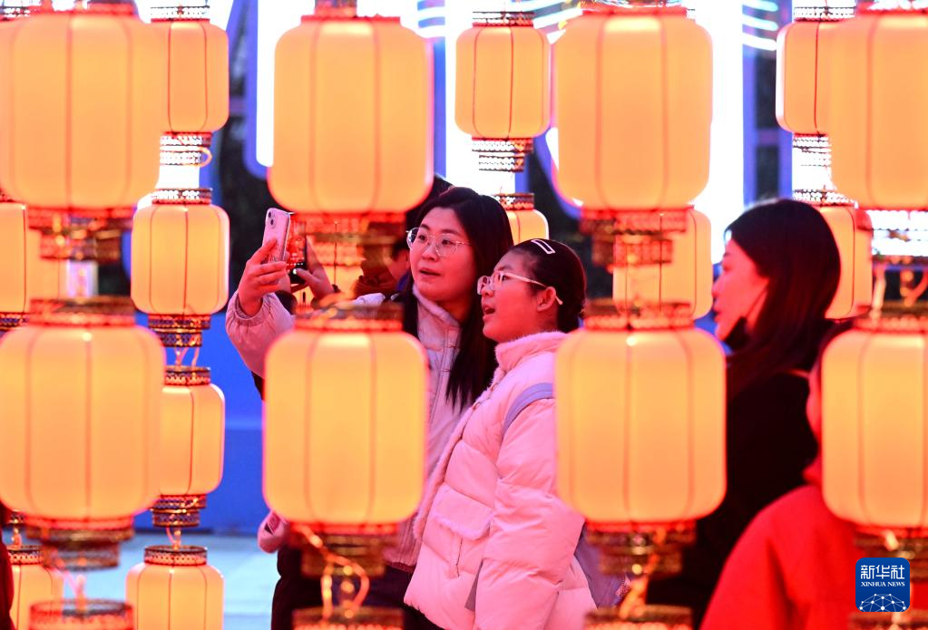 2月1日,游客在河北省石家庄市湾里庙步行街赏灯。新华社发(陈其保摄)
