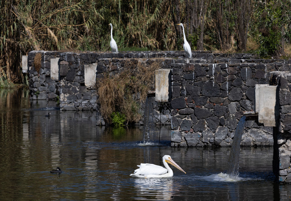 ↑1月30日在墨西哥首都墨西哥城霍奇米尔科拍摄的鹈鹕和白鹭。