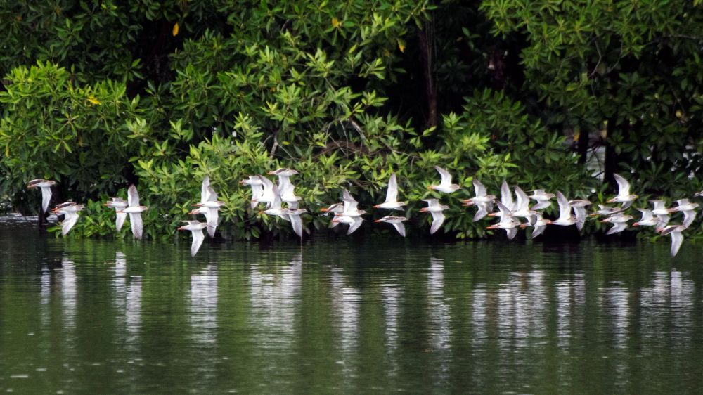↑新加坡双溪布洛湿地保护区的候鸟群(2022年11月4日拍摄)。