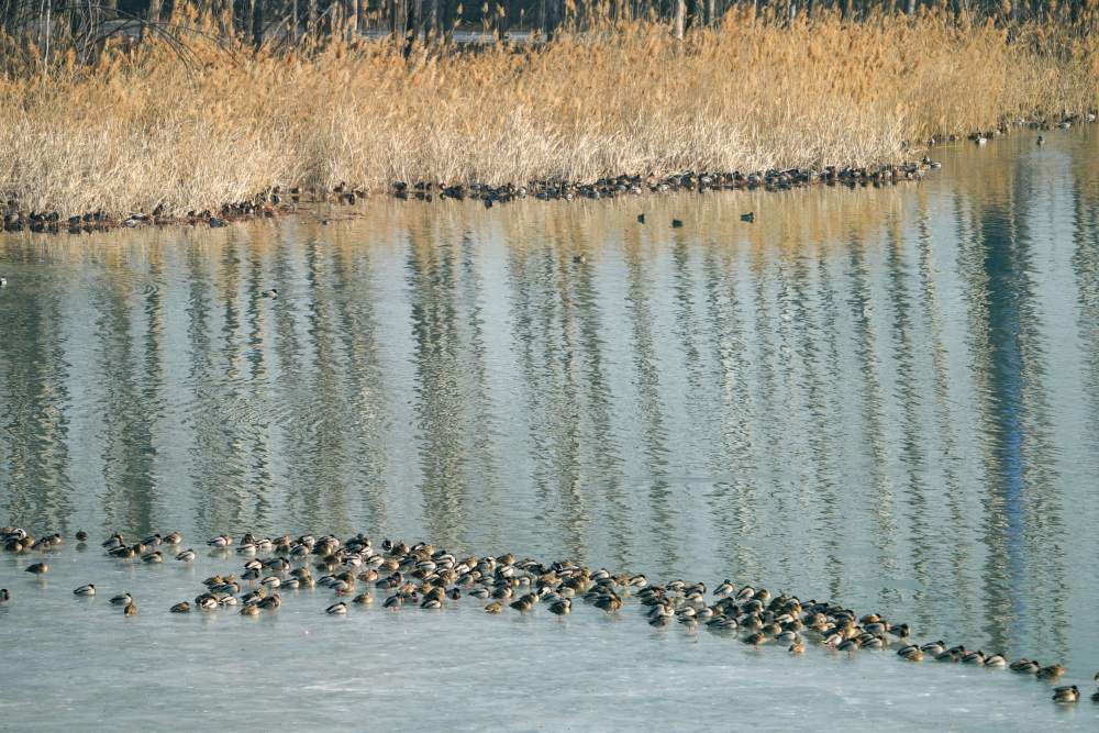 ↑1月20日拍摄的在北京野鸭湖湿地自然保护区越冬的野鸭群。