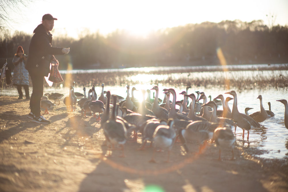 ↑游客在北京市南海子公园和鸿雁互动、拍照(2024年11月29日拍摄)。