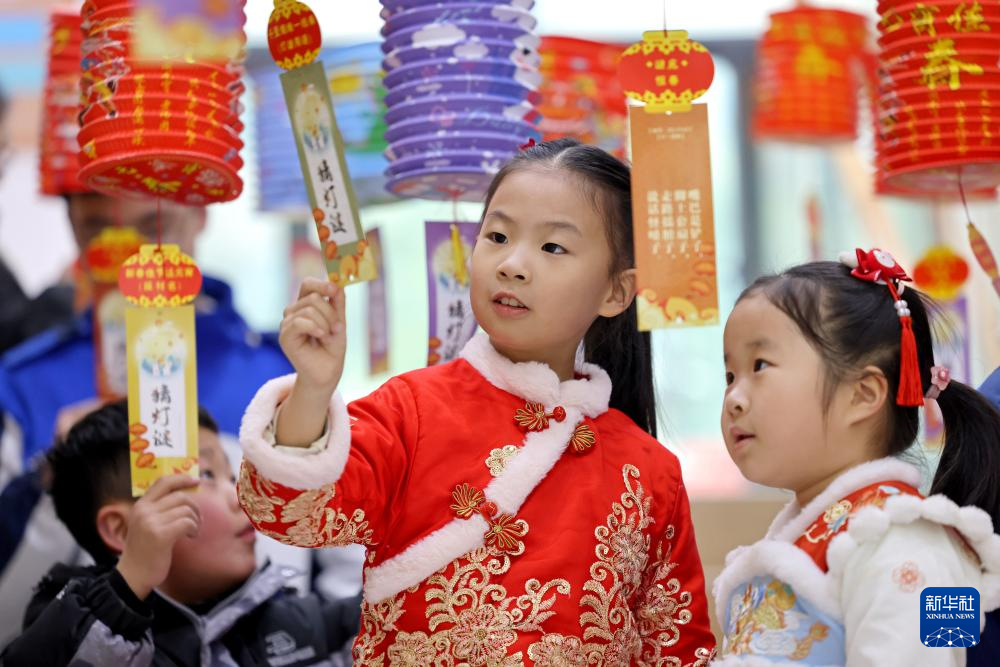 2月12日,小朋友在山东省枣庄市市中区中心街街道大观园社区参加“猜灯谜 闹元宵”活动。新华社发(孙中喆摄)