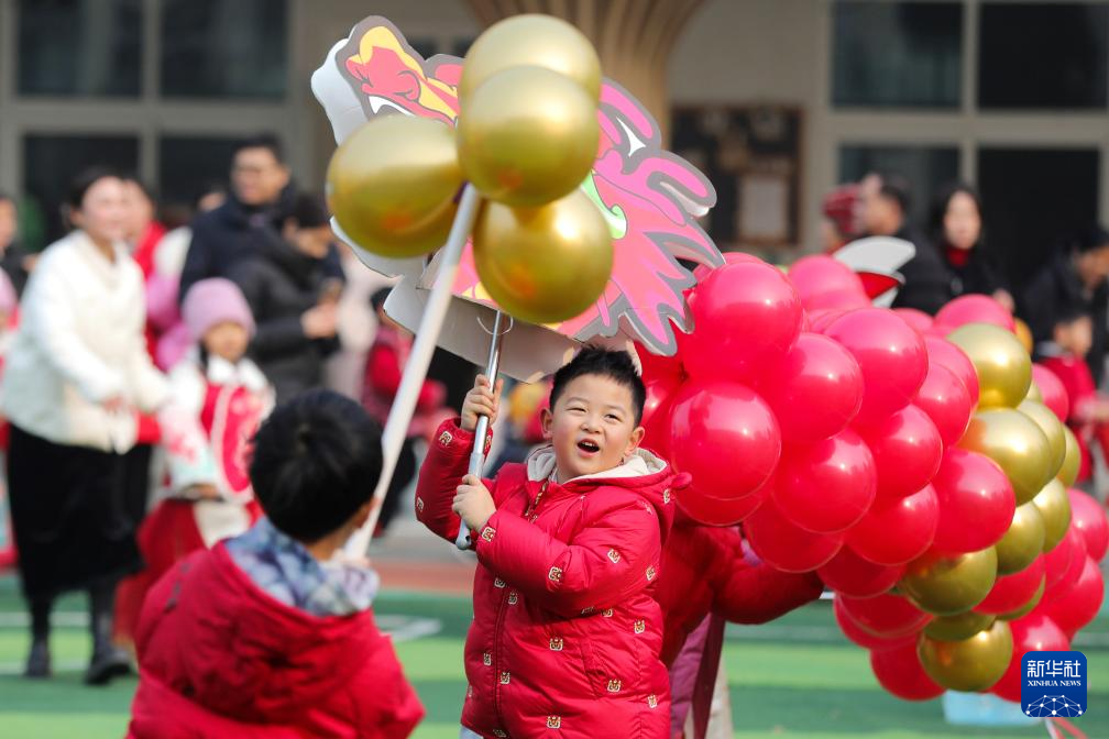 2月12日,小朋友在安徽省淮北市第二实验幼儿园参加舞龙闹元宵游戏。新华社发(万善朝摄)