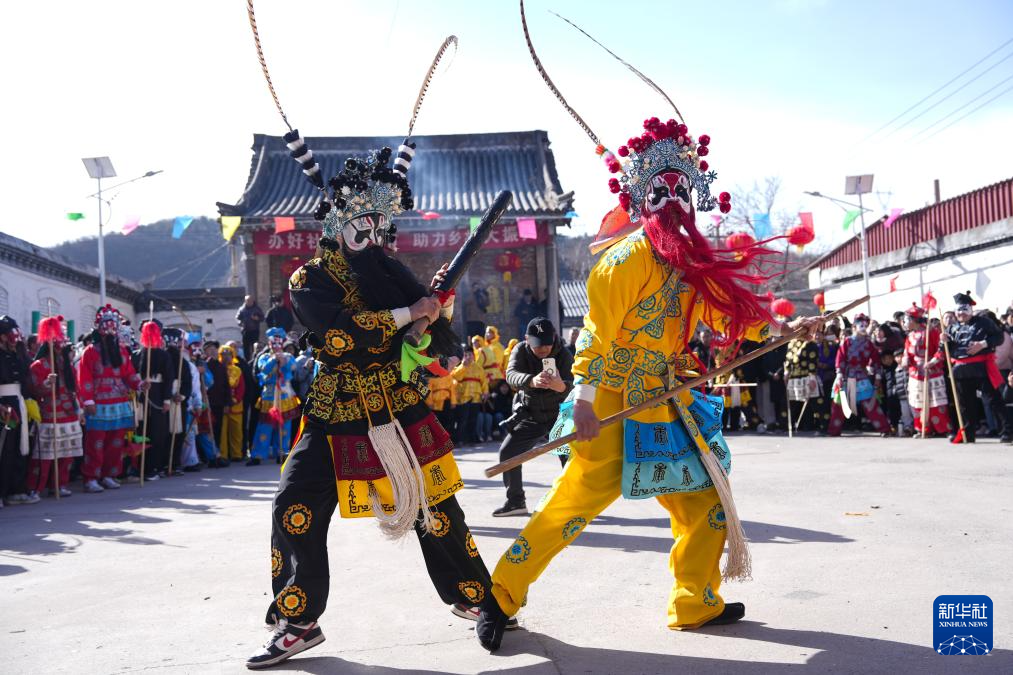 2月12日,社火艺人在河北省井陉县小作镇桃林坪村表演社火。新华社发(梁子栋摄)