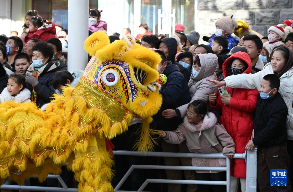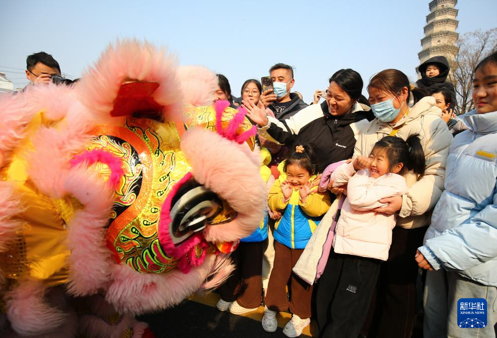 2月12日,在山东省滕州市龙泉广场,舞狮艺人与观众互动。新华社发(李志军摄)