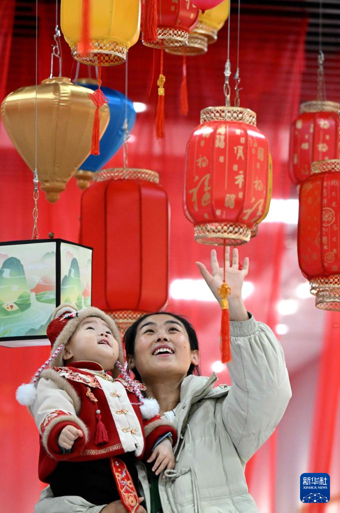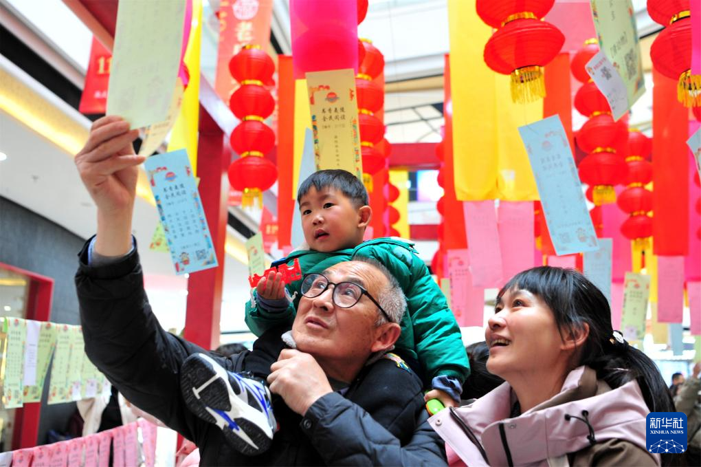 2月12日,市民带着小孩在湖北省宜昌市夷陵区“‘夷’起过元宵 ‘陵’蛇庆团圆”元宵节文化活动现场猜灯谜。新华社发(张国荣摄)