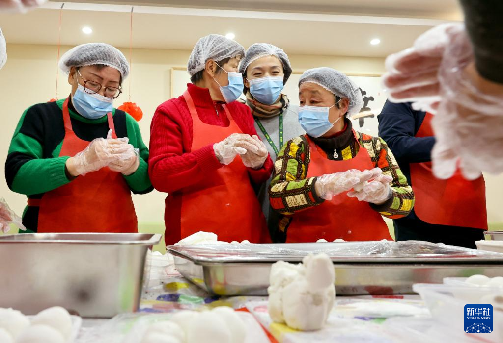 2月12日,社区居民在上海黄浦区老西门街道“厢遇85”社区长者食堂包汤圆。新华社记者 方喆 摄