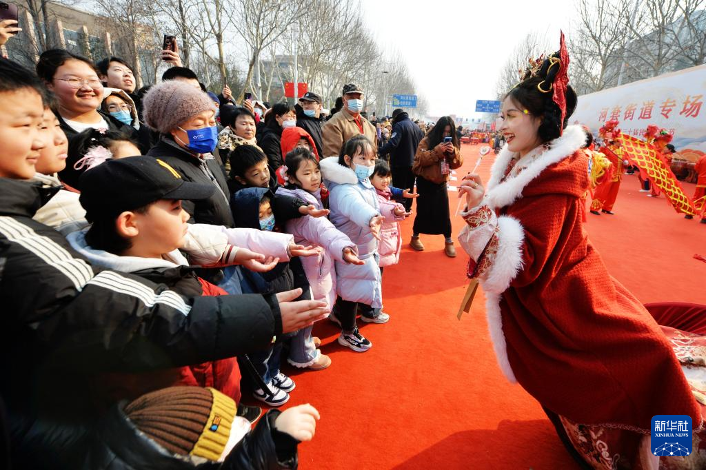 2月12日,演员在山东省青岛市城阳区民间艺术展演活动上与小朋友互动。新华社发(王海滨摄)