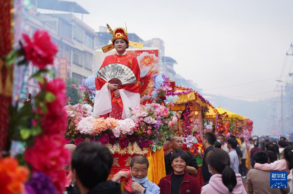 2月12日,艺人在福建省龙岩市永定区社前村举行的传统民俗“走古事”活动中表演。新华社发(周杨东摄)