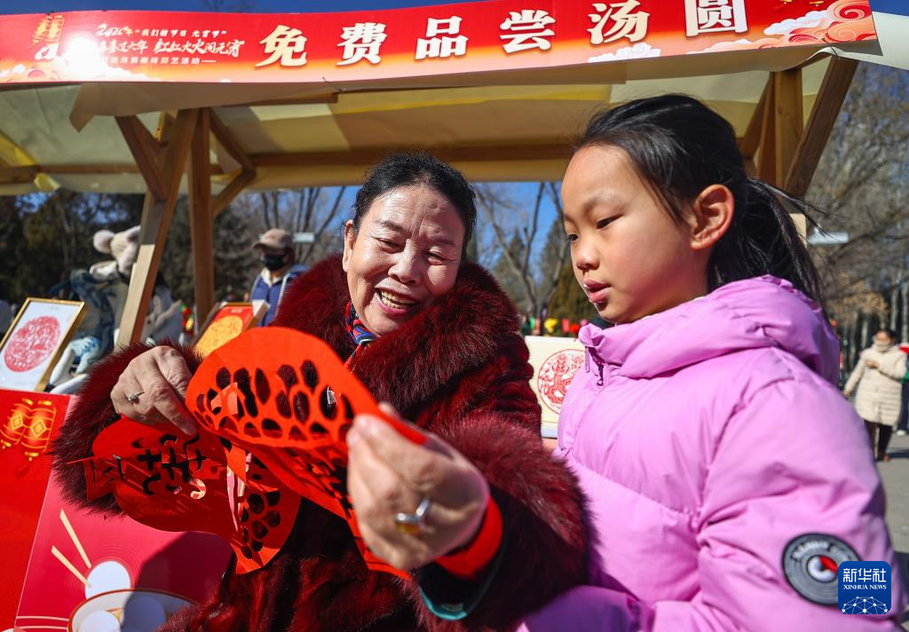 2月12日,回族剪纸项目国家级非物质文化遗产代表性传承人伏兆娥(左)在宁夏银川市中山公园内向小朋友展示以元宵节为主题的剪纸作品。新华社记者 杨植森 摄