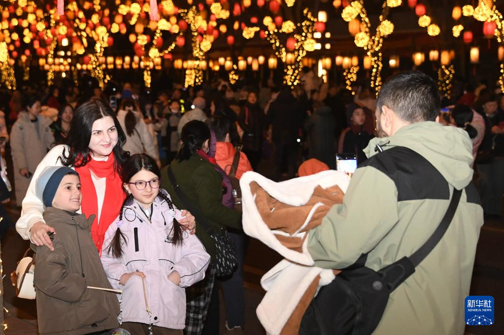 2月12日,市民游客在甘肃省敦煌市街头与舞狮互动。新华社发(张晓亮摄)