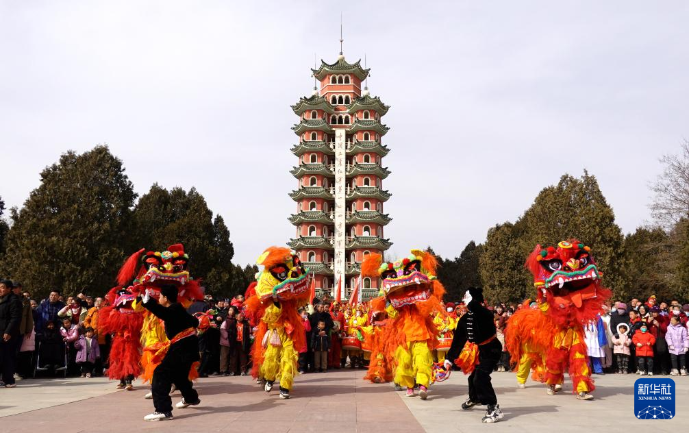 2月12日,民间艺人在甘肃省会宁县会师镇表演舞狮。新华社发(常琦彪摄)