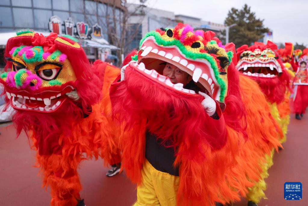 2月12日,民间艺人在山东省荣成市樱花湖体育公园表演舞狮。新华社发(李信君摄)