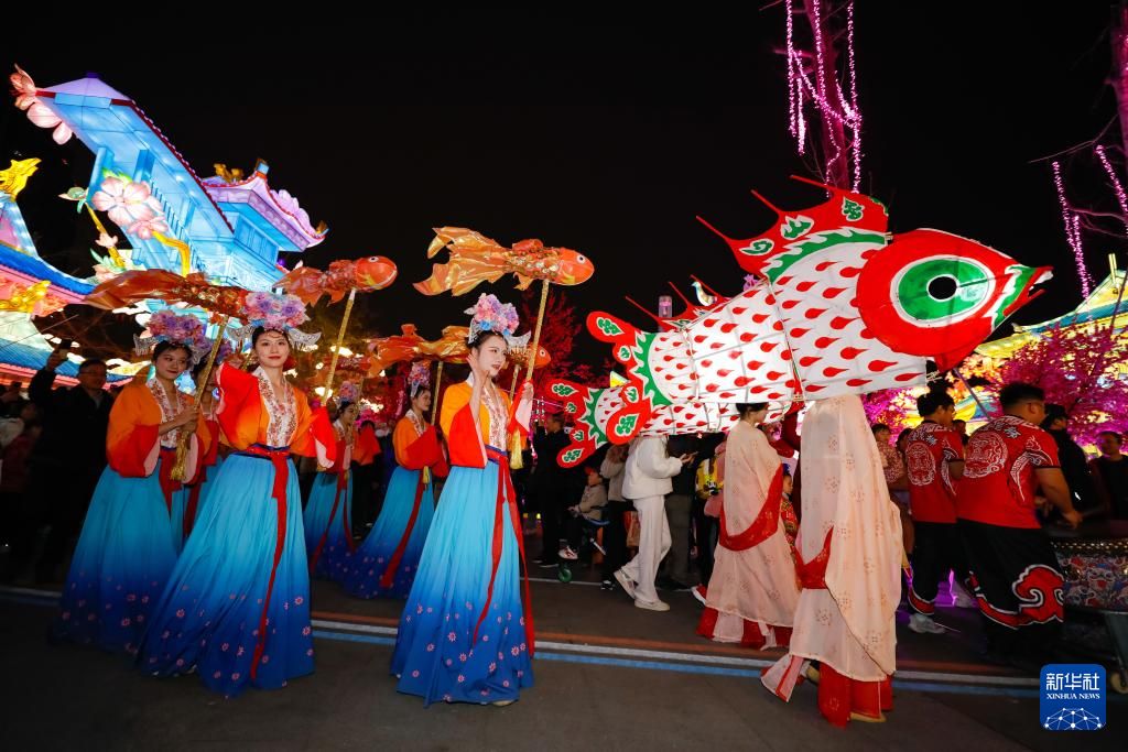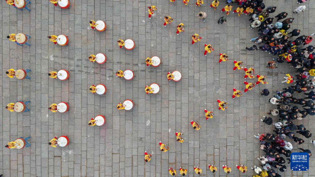 2月12日,艺人在河南洛阳隋唐洛阳城天街表演(无人机照片)。新华社发(李卫超摄)