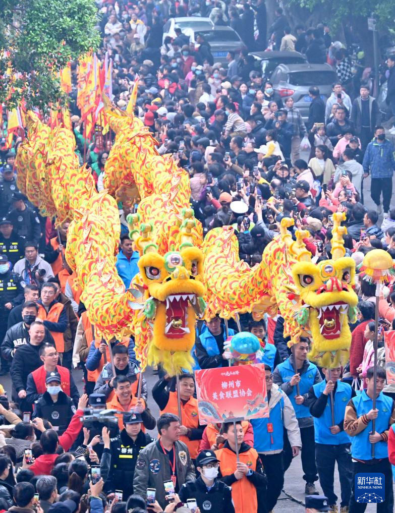2月12日,人们在广西柳州市滨江西路观看舞龙巡游。新华社发(黎寒池摄)