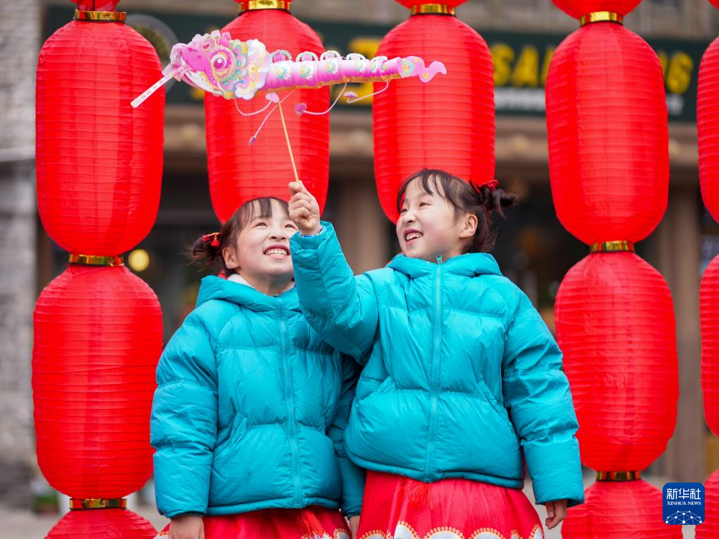 2月12日,一对姊妹花手持蛇灯在江苏省兴化市八字桥文旅休闲街区游玩。新华社发(周社根摄)