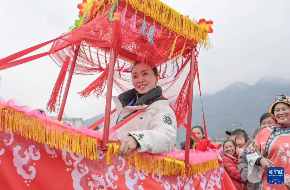 2月12日,演员在湖北省鹤峰县举行的元宵佳节非遗文化巡游展演中表演采莲船。新华社发(杨顺丕摄)