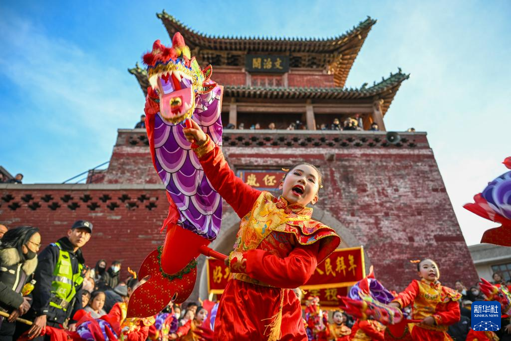 2月12日,在河南省鹤壁市浚县古城,小朋友在进行民俗表演。新华社发(王高超摄)