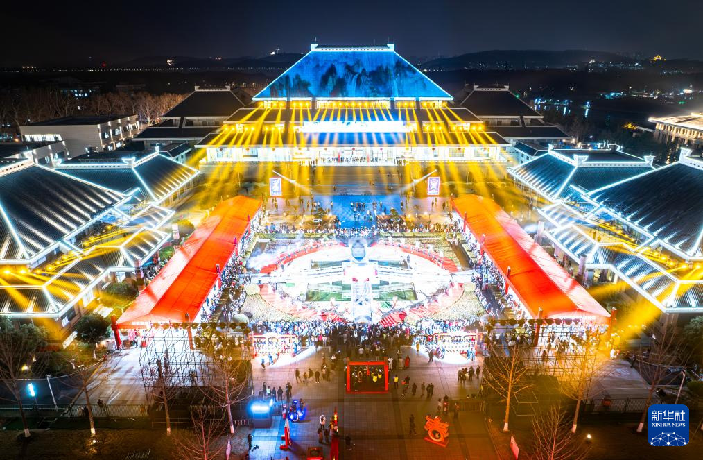 2月12日拍摄的湖北省博物馆“钟鸣楚天元宵夜”灯会活动(无人机照片)。新华社记者 肖艺九 摄