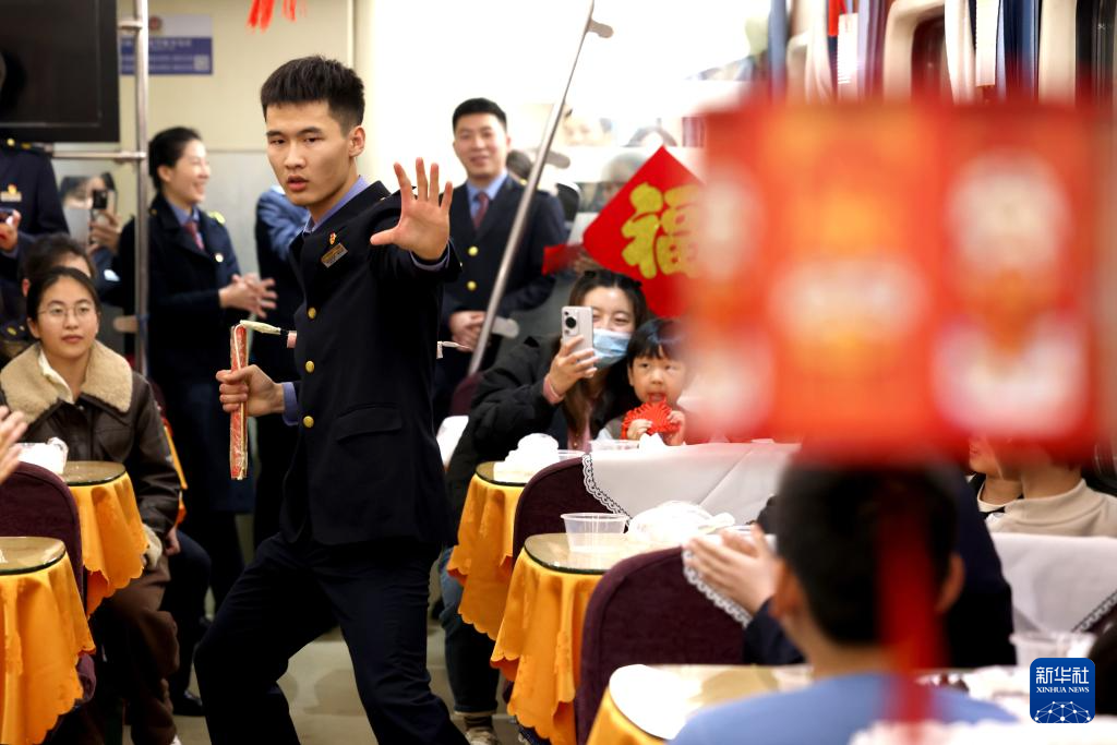 2月12日,在福州开往成都的Z392次列车上,乘务员为旅客献上精彩的文艺演出。新华社发(王旺旺 摄)