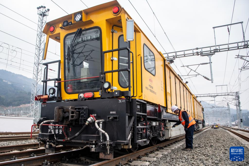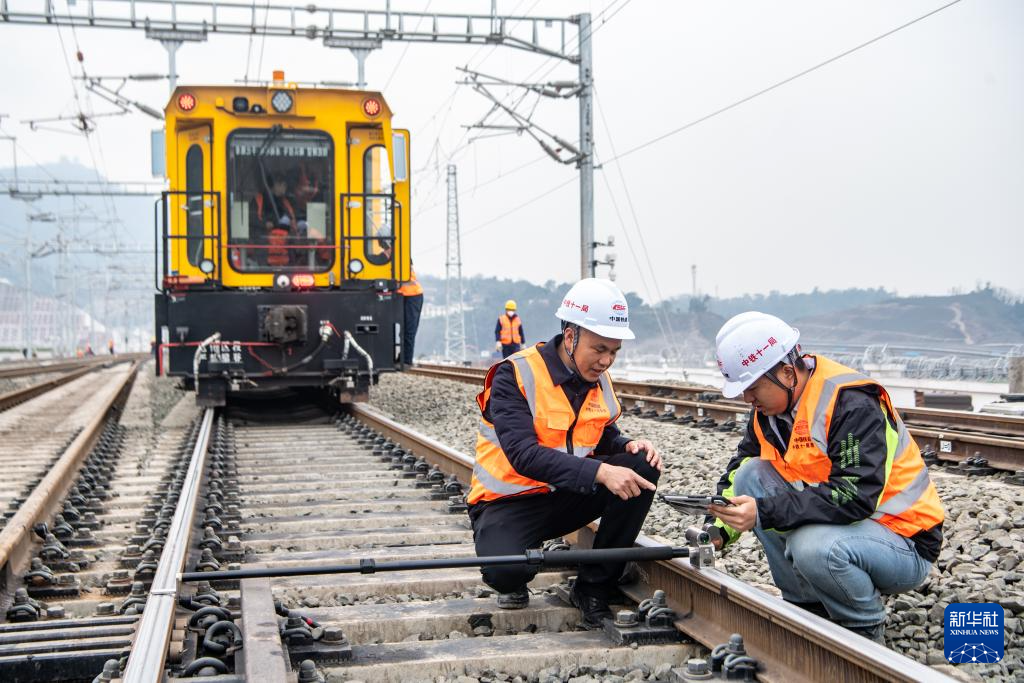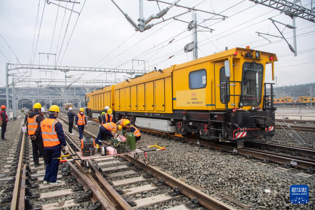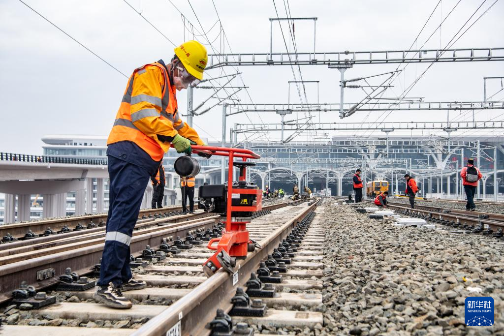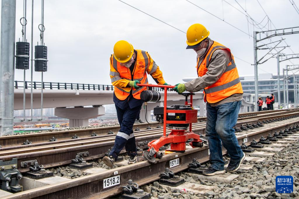 2月18日,在重庆东站建设施工现场,铁路工人在对线路进行精调作业。新华社记者 唐奕 摄