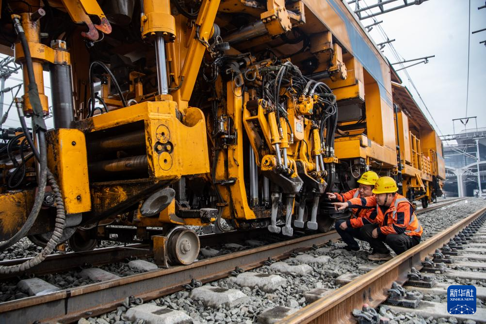 2月18日,在重庆东站建设施工现场,中铁十一局的铁路工人对大机捣固车进行检查。新华社记者 唐奕 摄