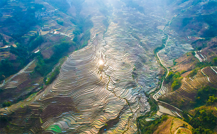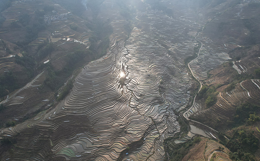 春耕开始后,航拍之下被灌满水的梯田波光荡漾,层层叠叠,高低错落,犹如镶嵌在翠绿山峦之间的彩色画卷。