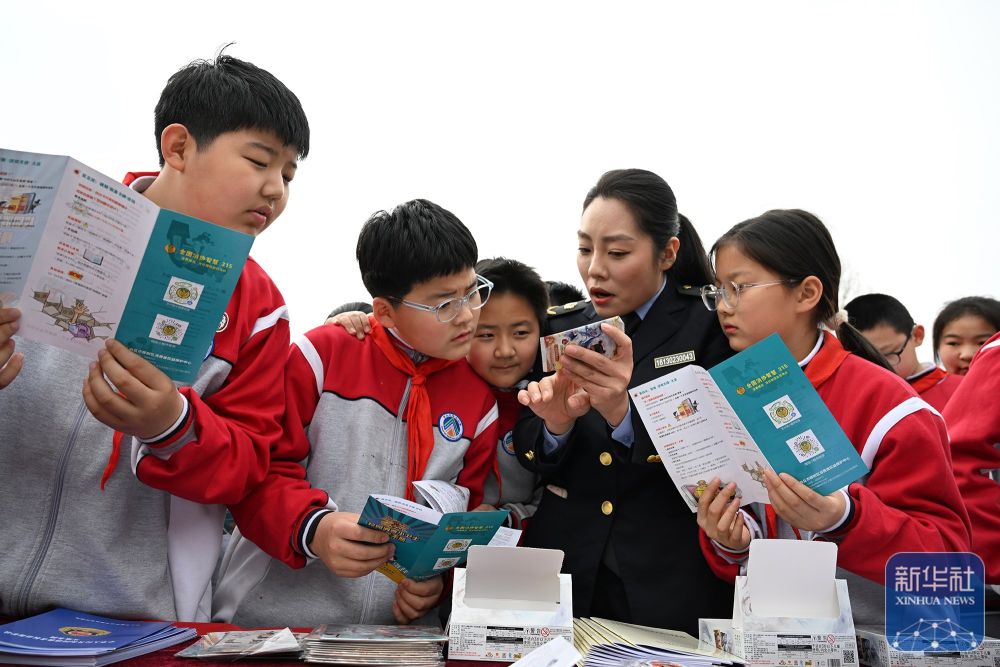 3月13日,在河南省商丘市培文小学,市场监管局消保中心工作人员向学生们传授 “盲盒” 消费陷阱识别方法及应对技巧。新华社发(李恒摄)