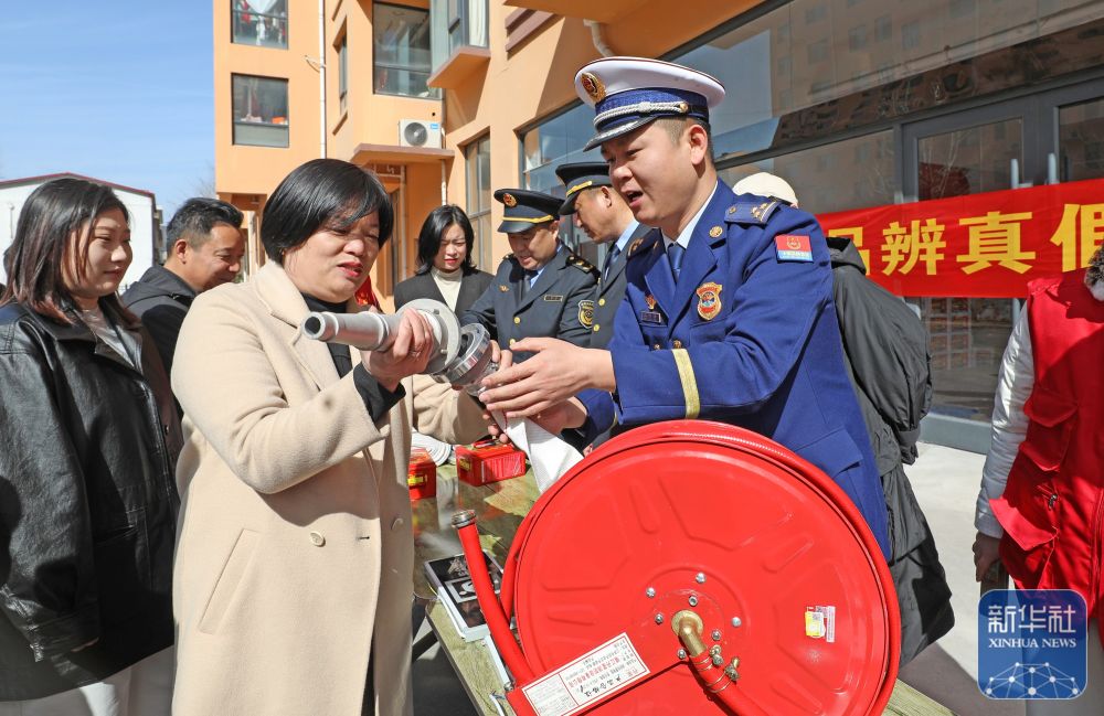 3月14日,在山东省临沂市郯城县郯城街道广悦社区,消防救援人员和市场监督管理部门工作人员为居民讲解如何辨别消防产品真假。新华社发(张春雷摄)