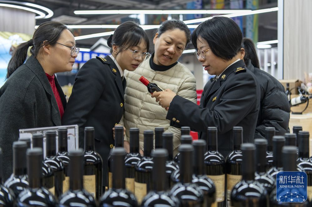 3月14日,浙江省金华市金义综保区进口商品直购中心内,金华海关关员向前来购买跨境商品的顾客介绍质量安全风险和选购提示。新华社发(胡肖飞摄)