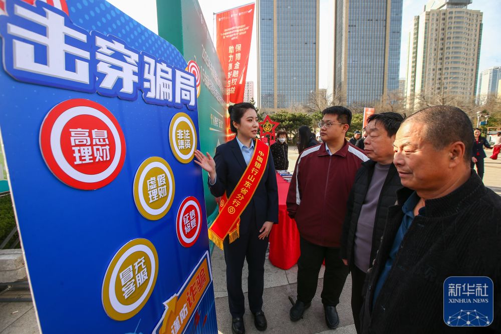 3月14日,在山东省济南市槐荫广场,银行职员为市民讲解金融领域反诈常识。新华社发(郝鑫城摄)