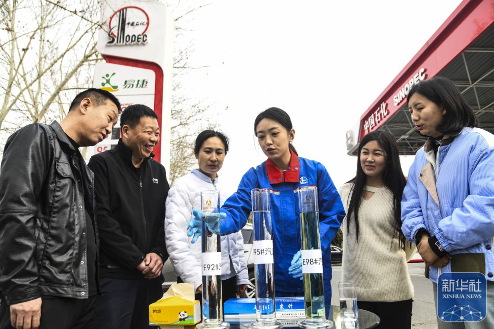 3月13日,在河南省济源市一加油站,工作人员讲解如何鉴别油品质量。新华社发(苗秋闹摄)