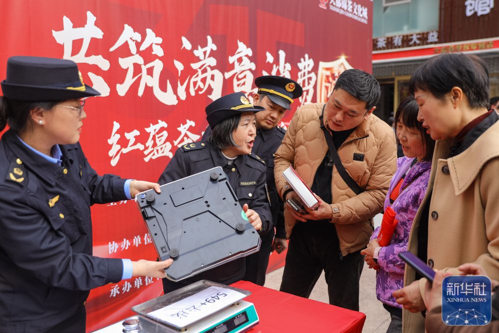 3月14日,在山东省青岛市李沧区天都锦茶文化城举办的国际消费者权益日宣传活动中,工作人员为市民介绍合格计量器具辨别方法。新华社发(张鹰摄)