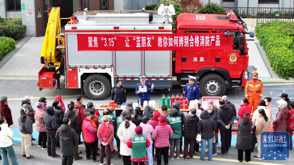 3月13日,在江苏省淮安市洪泽区高良涧街道,消防员为市民讲解如何辨别消防产品真假(无人机照片)。新华社发(殷潮摄)