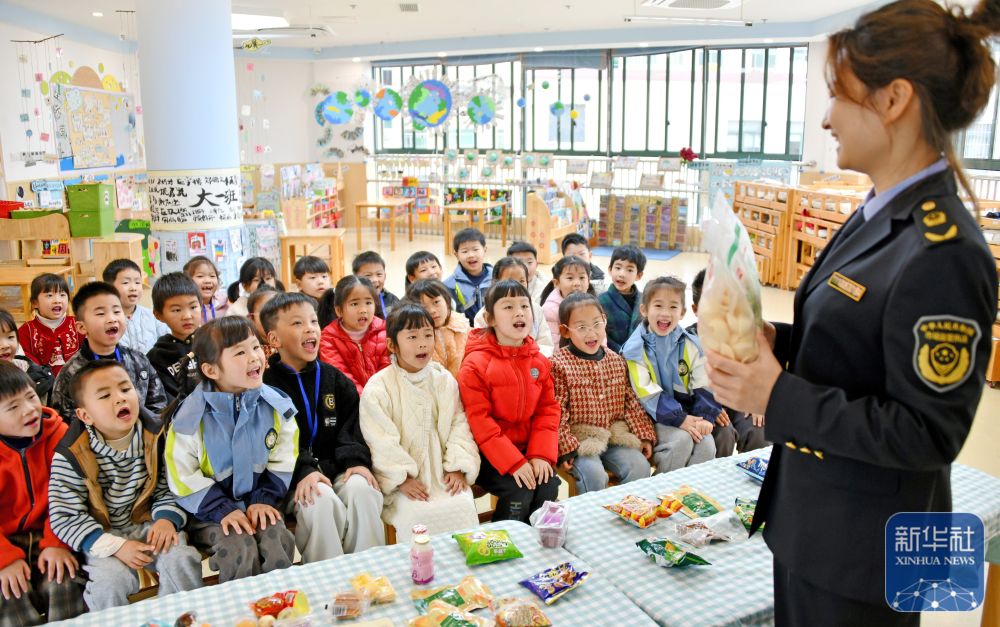 3月14日,在浙江省台州市仙居县中心幼儿园,市场监督管理局工作人员为孩子们讲解食品安全等方面知识。新华社发(王华斌摄)