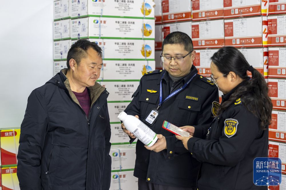 3月13日,江苏省泰州市姜堰区农业执法大队执法人员对顾高镇一家农资经营网点库存农药进行手机扫码检查。新华社发(汤德宏摄)