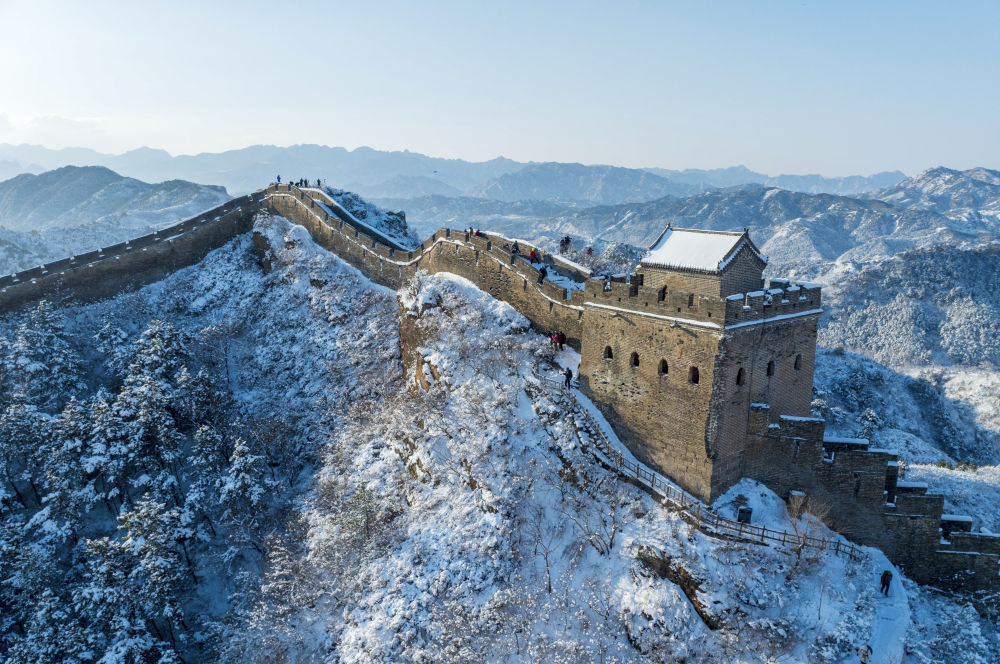 ↑ 3月16日在北京市密云区拍摄的古北口长城雪景(无人机照片)。新华社发(刘满仓摄)